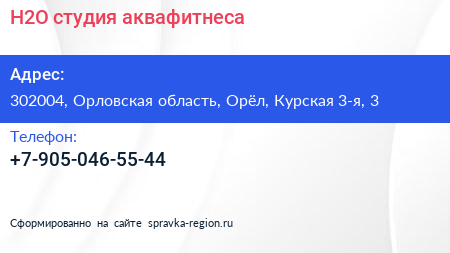 H2O, студия аквафитнеса по адресу 302004, Орловская область, Орёл, Курская 3-я, 3 в дальнейшем Организация, размещена в следующих категориях: