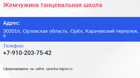 Жемчужина, танцевальная школа по адресу 302016, Орловская область, Орёл, Карачевский переулок, 6 в дальнейшем Организация, размещена в следующих категориях: