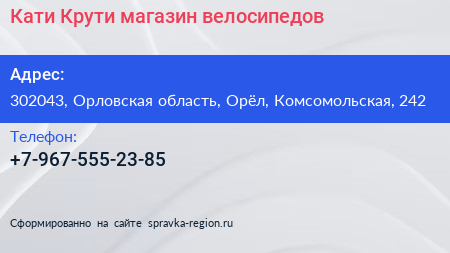 Кати Крути, магазин велосипедов по адресу 302043, Орловская область, Орёл, Комсомольская, 242 в дальнейшем Организация, размещена в следующих категориях: