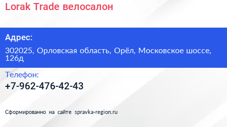 Lorak Trade, велосалон по адресу 302025, Орловская область, Орёл, Московское шоссе, 126д в дальнейшем Организация, размещена в следующих категориях:
