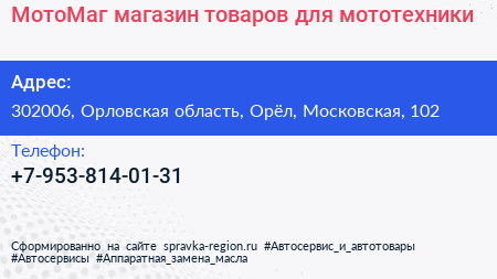МотоМаг, магазин товаров для мототехники по адресу 302006, Орловская область, Орёл, Московская, 102 в дальнейшем Организация, размещена в следующих категориях:
