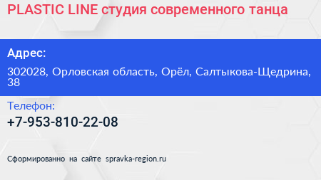 PLASTIC LINE, студия современного танца по адресу 302028, Орловская область, Орёл, Салтыкова-Щедрина, 38 в дальнейшем Организация, размещена в следующих категориях: