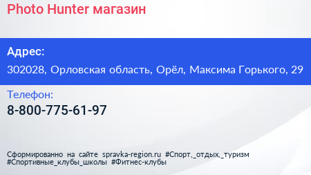 Photo-Hunter, магазин по адресу 302028, Орловская область, Орёл, Максима Горького, 29 в дальнейшем Организация, размещена в следующих категориях:
