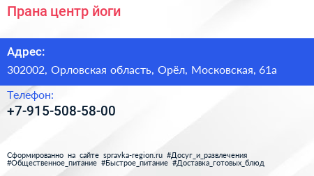 Прана, центр йоги по адресу 302002, Орловская область, Орёл, Московская, 61а в дальнейшем Организация, размещена в следующих категориях: