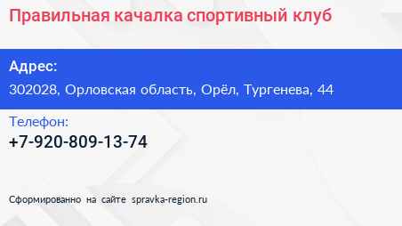 Правильная качалка, спортивный клуб по адресу 302028, Орловская область, Орёл, Тургенева, 44 в дальнейшем Организация, размещена в следующих категориях: