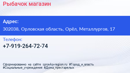 Рыбачок, магазин по адресу 302038, Орловская область, Орёл, Металлургов, 17 в дальнейшем Организация, размещена в следующих категориях: