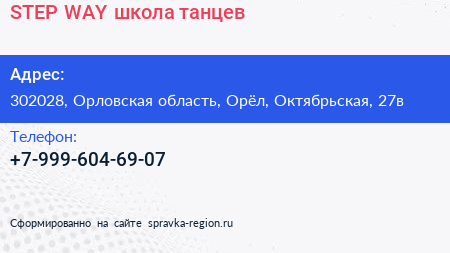 STEP WAY, школа танцев по адресу 302028, Орловская область, Орёл, Октябрьская, 27в в дальнейшем Организация, размещена в следующих категориях: