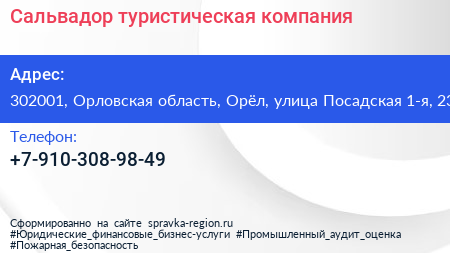 Сальвадор, туристическая компания по адресу 302001, Орловская область, Орёл, улица Посадская 1-я, 23 в дальнейшем Организация, размещена в следующих категориях: