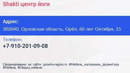 Shakti, центр йоги по адресу 302040, Орловская область, Орёл, 60 лет Октября, 15 в дальнейшем Организация, размещена в следующих категориях: