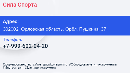 Сила Спорта по адресу 302002, Орловская область, Орёл, Пушкина, 37 в дальнейшем Организация, размещена в следующих категориях: