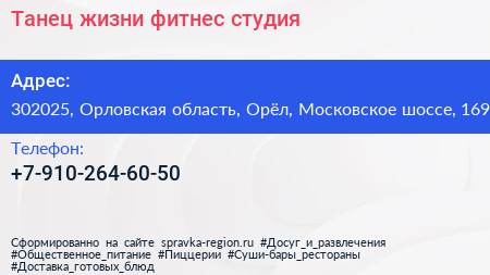 Танец жизни, фитнес-студия по адресу 302025, Орловская область, Орёл, Московское шоссе, 169 в дальнейшем Организация, размещена в следующих категориях: