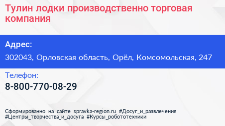 Тулин лодки, производственно-торговая компания по адресу 302043, Орловская область, Орёл, Комсомольская, 247 в дальнейшем Организация, размещена в следующих категориях: