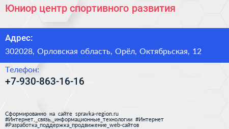 Юниор, центр спортивного развития по адресу 302028, Орловская область, Орёл, Октябрьская, 12 в дальнейшем Организация, размещена в следующих категориях: