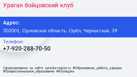 Ураган, бойцовский клуб по адресу 302001, Орловская область, Орёл, Черкасская, 39 в дальнейшем Организация, размещена в следующих категориях: