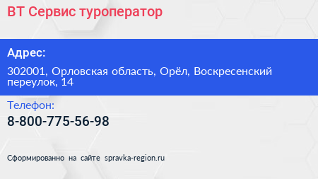 ВТ-Сервис, туроператор по адресу 302001, Орловская область, Орёл, Воскресенский переулок, 14 в дальнейшем Организация, размещена в следующих категориях: