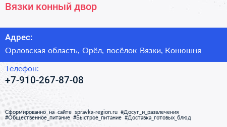 Вязки, конный двор по адресу Орловская область, Орёл, посёлок Вязки, Конюшня в дальнейшем Организация, размещена в следующих категориях: