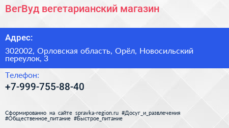 ВегВуд, вегетарианский магазин по адресу 302002, Орловская область, Орёл, Новосильский переулок, 3 в дальнейшем Организация, размещена в следующих категориях: