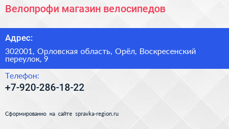 Велопрофи, магазин велосипедов по адресу 302001, Орловская область, Орёл, Воскресенский переулок, 9 в дальнейшем Организация, размещена в следующих категориях:
