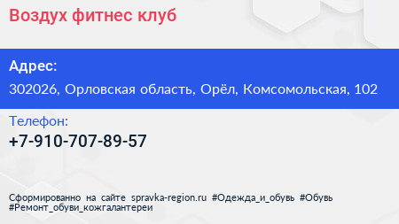 Воздух, фитнес-клуб по адресу 302026, Орловская область, Орёл, Комсомольская, 102 в дальнейшем Организация, размещена в следующих категориях: