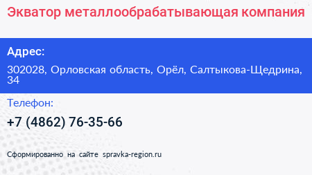 Экватор, металлообрабатывающая компания по адресу 302028, Орловская область, Орёл, Салтыкова-Щедрина, 34 в дальнейшем Организация, размещена в следующих категориях: