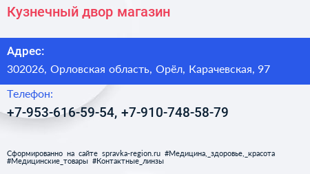 Кузнечный двор, магазин по адресу 302026, Орловская область, Орёл, Карачевская, 97 в дальнейшем Организация, размещена в следующих категориях: