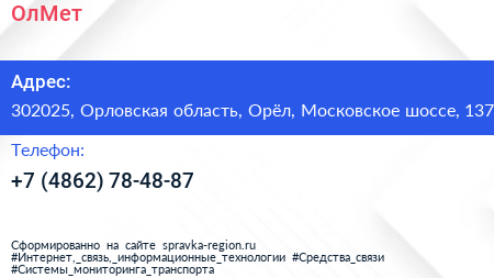 ОлМет по адресу 302025, Орловская область, Орёл, Московское шоссе, 137 в дальнейшем Организация, размещена в следующих категориях:
