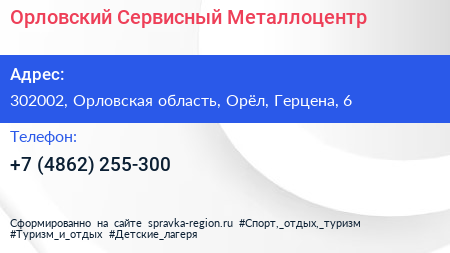 Орловский Сервисный Металлоцентр по адресу 302002, Орловская область, Орёл, Герцена, 6 в дальнейшем Организация, размещена в следующих категориях: