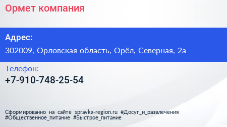 Ормет, компания по адресу 302009, Орловская область, Орёл, Северная, 2а в дальнейшем Организация, размещена в следующих категориях: