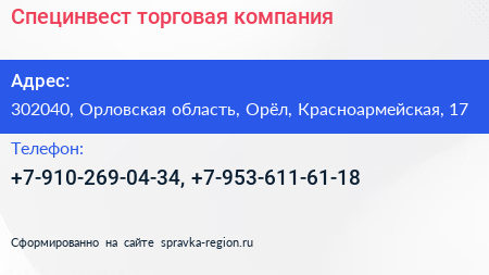 Специнвест, торговая компания по адресу 302040, Орловская область, Орёл, Красноармейская, 17 в дальнейшем Организация, размещена в следующих категориях: