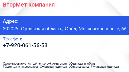 ВторМет, компания по адресу 302025, Орловская область, Орёл, Московское шоссе, 66 в дальнейшем Организация, размещена в следующих категориях: