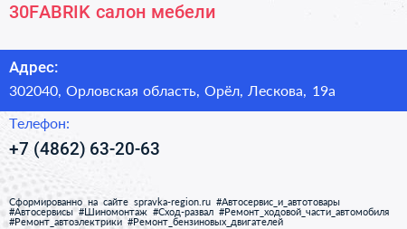 30FABRIK, салон мебели по адресу 302040, Орловская область, Орёл, Лескова, 19а в дальнейшем Организация, размещена в следующих категориях: