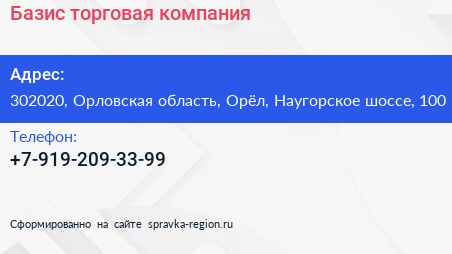 Базис, торговая компания по адресу 302020, Орловская область, Орёл, Наугорское шоссе, 100 в дальнейшем Организация, размещена в следующих категориях:
