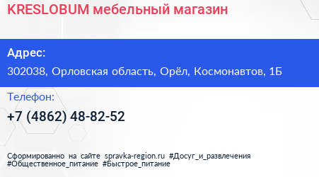 KRESLOBUM, мебельный магазин по адресу 302038, Орловская область, Орёл, Космонавтов, 1Б в дальнейшем Организация, размещена в следующих категориях: