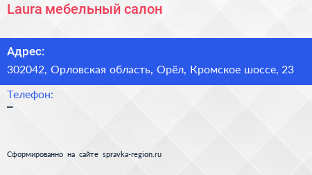 Laura, мебельный салон по адресу 302042, Орловская область, Орёл, Кромское шоссе, 23 в дальнейшем Организация, размещена в следующих категориях: