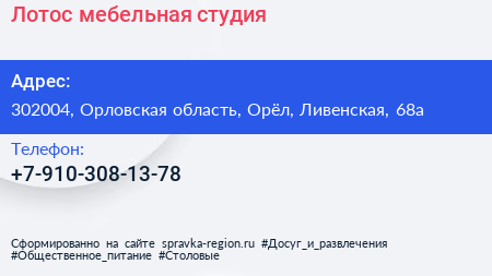 Лотос, мебельная студия по адресу 302004, Орловская область, Орёл, Ливенская, 68а в дальнейшем Организация, размещена в следующих категориях: