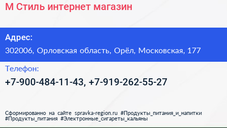 М-Стиль, интернет-магазин по адресу 302006, Орловская область, Орёл, Московская, 177 в дальнейшем Организация, размещена в следующих категориях: