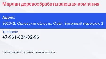 Марлин, деревообрабатывающая компания по адресу 302042, Орловская область, Орёл, Бетонный переулок, 2 в дальнейшем Организация, размещена в следующих категориях: