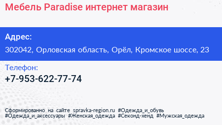 Мебель Paradise, интернет-магазин по адресу 302042, Орловская область, Орёл, Кромское шоссе, 23 в дальнейшем Организация, размещена в следующих категориях: