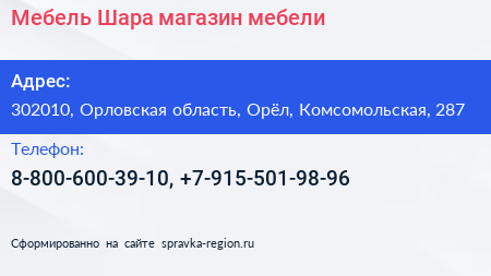 Мебель Шара, магазин мебели по адресу 302010, Орловская область, Орёл, Комсомольская, 287 в дальнейшем Организация, размещена в следующих категориях:
