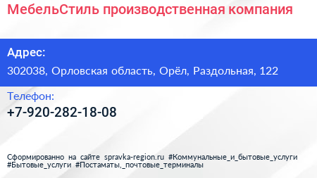 МебельСтиль, производственная компания по адресу 302038, Орловская область, Орёл, Раздольная, 122 в дальнейшем Организация, размещена в следующих категориях: