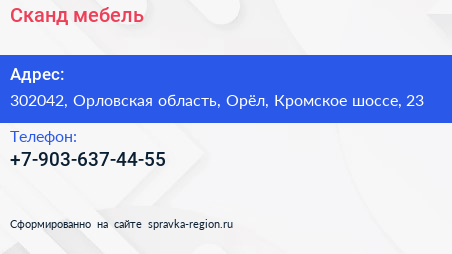 Сканд мебель по адресу 302042, Орловская область, Орёл, Кромское шоссе, 23 в дальнейшем Организация, размещена в следующих категориях: