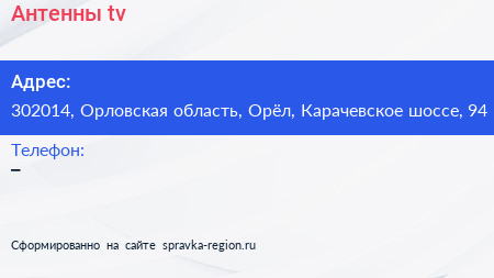 Антенны.tv по адресу 302014, Орловская область, Орёл, Карачевское шоссе, 94 в дальнейшем Организация, размещена в следующих категориях: