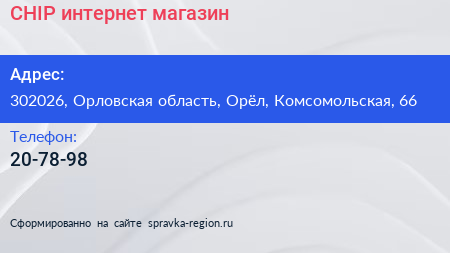 CHIP, интернет-магазин по адресу 302026, Орловская область, Орёл, Комсомольская, 66 в дальнейшем Организация, размещена в следующих категориях: