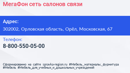 МегаФон, сеть салонов связи по адресу 302002, Орловская область, Орёл, Московская, 67 в дальнейшем Организация, размещена в следующих категориях: