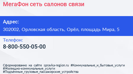 МегаФон, сеть салонов связи по адресу 302002, Орловская область, Орёл, площадь Мира, 5 в дальнейшем Организация, размещена в следующих категориях: