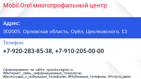 Mobil Orel, многопрофильный центр по адресу 302005, Орловская область, Орёл, Циолковского, 13 в дальнейшем Организация, размещена в следующих категориях: