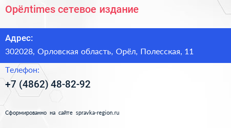 Орёлtimes, сетевое издание по адресу 302028, Орловская область, Орёл, Полесская, 11 в дальнейшем Организация, размещена в следующих категориях: