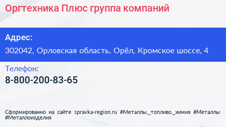 Оргтехника Плюс, группа компаний по адресу 302042, Орловская область, Орёл, Кромское шоссе, 4 в дальнейшем Организация, размещена в следующих категориях: