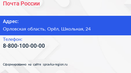 Почта России по адресу Орловская область, Орёл, Школьная, 24 в дальнейшем Организация, размещена в следующих категориях: