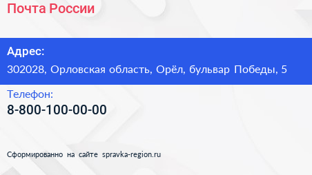 Почта России по адресу 302028, Орловская область, Орёл, бульвар Победы, 5 в дальнейшем Организация, размещена в следующих категориях: